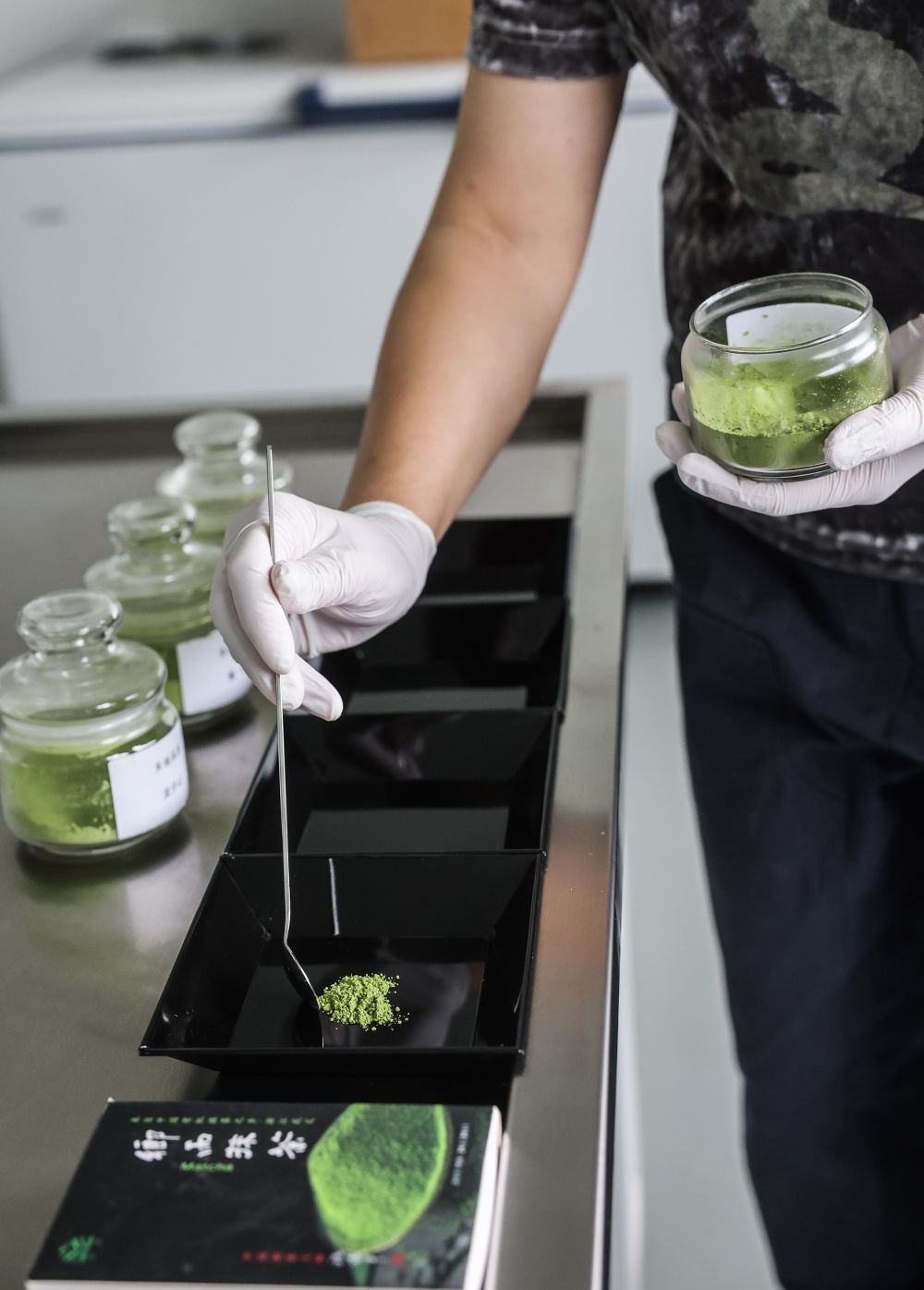 4月21日,在武义县的浙江乡雨茶叶有限公司的质检室内,工作人员在展示不同品种绿茶制成的抹茶粉。