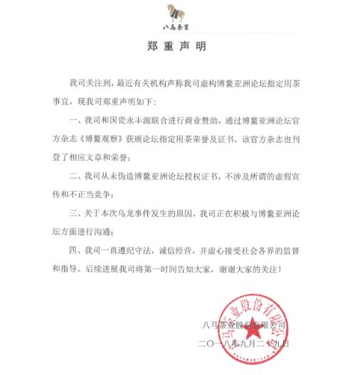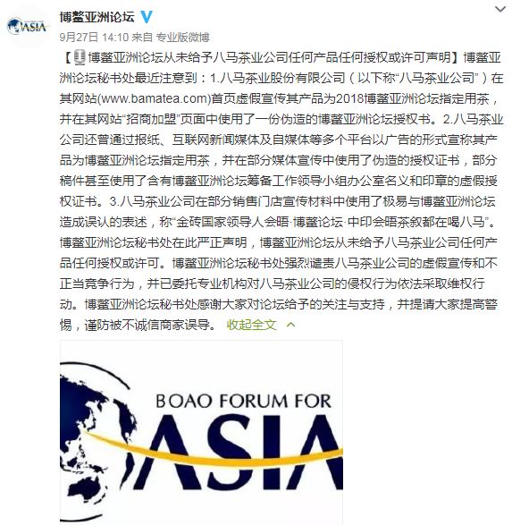 八马此番的回应,是针对博鳌亚洲论坛官微9月27日的公开“点名”。论坛秘书处称,八马茶业任何产品从未获得其给予的任何授权或许可声明,他们强烈谴责八马茶业的虚假宣传和不正当竞争行为。